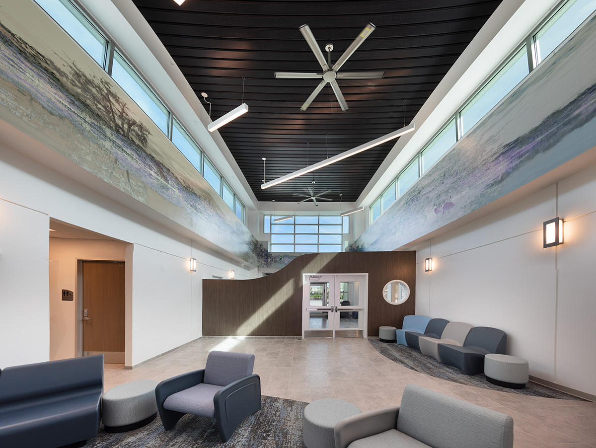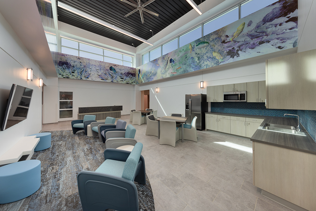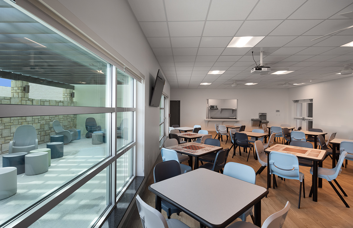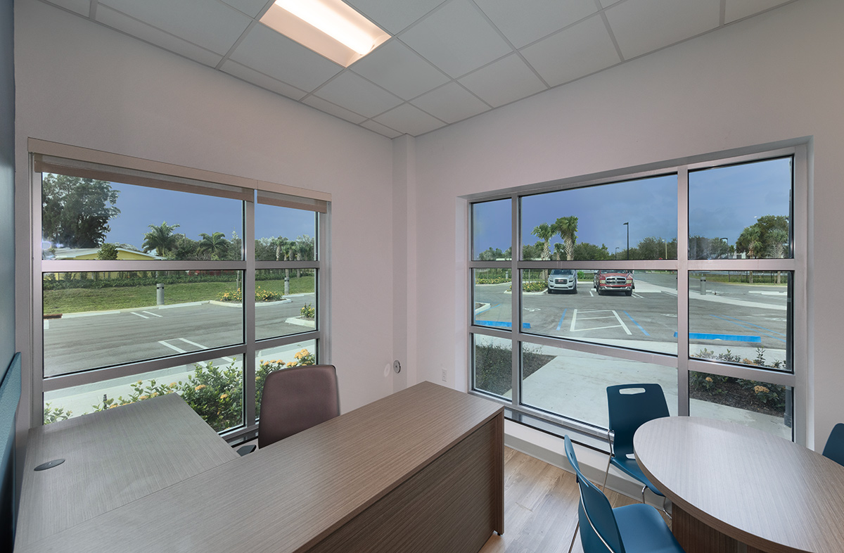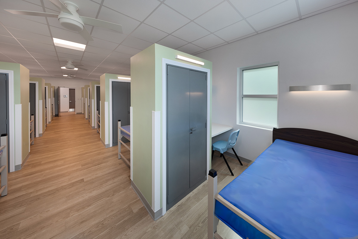This interim housing and resource center for the homeless in Palm Beach County will provide a 90-day transition where they assist in obtaining employment, advice as to where to get an education, find apartments to rent or share rent and even provide them with basic furniture. The basic program includes offices for counseling and receiving the homeless, dining and a community hall. There are 60 bedrooms, each with a bed, wardrobe, and desk. These bedrooms are grouped in pods for men, women, families, and male and female youth. There will also be three private bedrooms for couples and 14 beds for transitional drop-off for those who stay for 30 days.